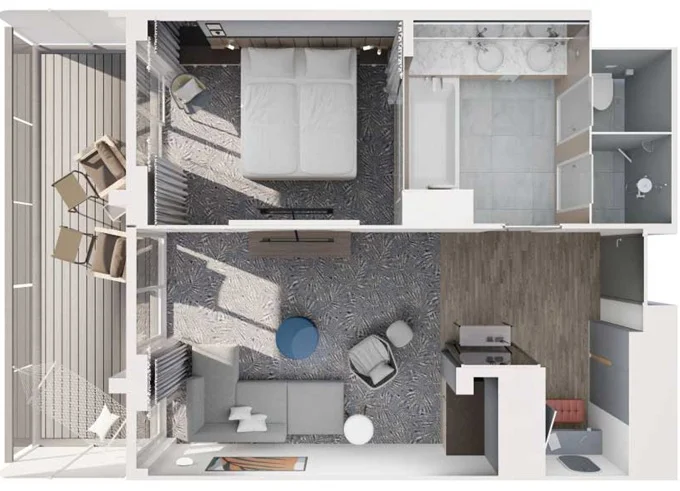 | JKBO - Junior Suite s balkónom B 26 m² + balkón 7 m² so stoličkami a podnožkami. 8-12. paluba. Max 4 osoby. Výhody Junior Suite. | 3 998 € 1 999 € za osobu |