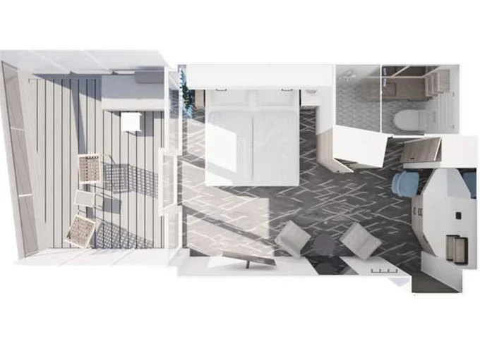 | VEKO - Kajuta s terasou 20 m² + balkón 13 m² so stoličkami a váľandou. 15. paluba. Max 2 osoby. | 2 968 € 2 968 € za osobu |